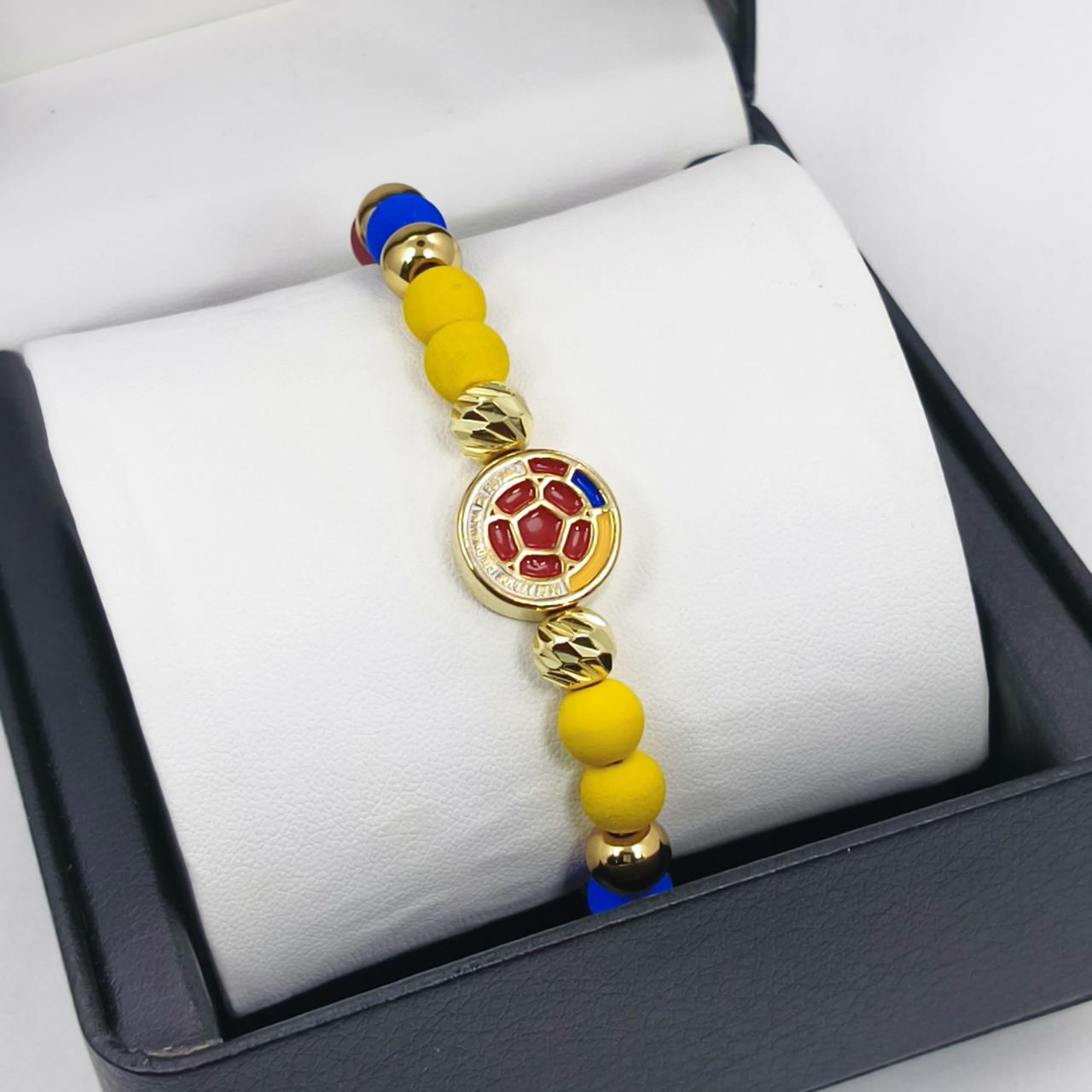 Luce el orgullo de Colombia con esta manilla premium, diseñada en balines tricolor y un dije central en níquel chapado en oro 18K.