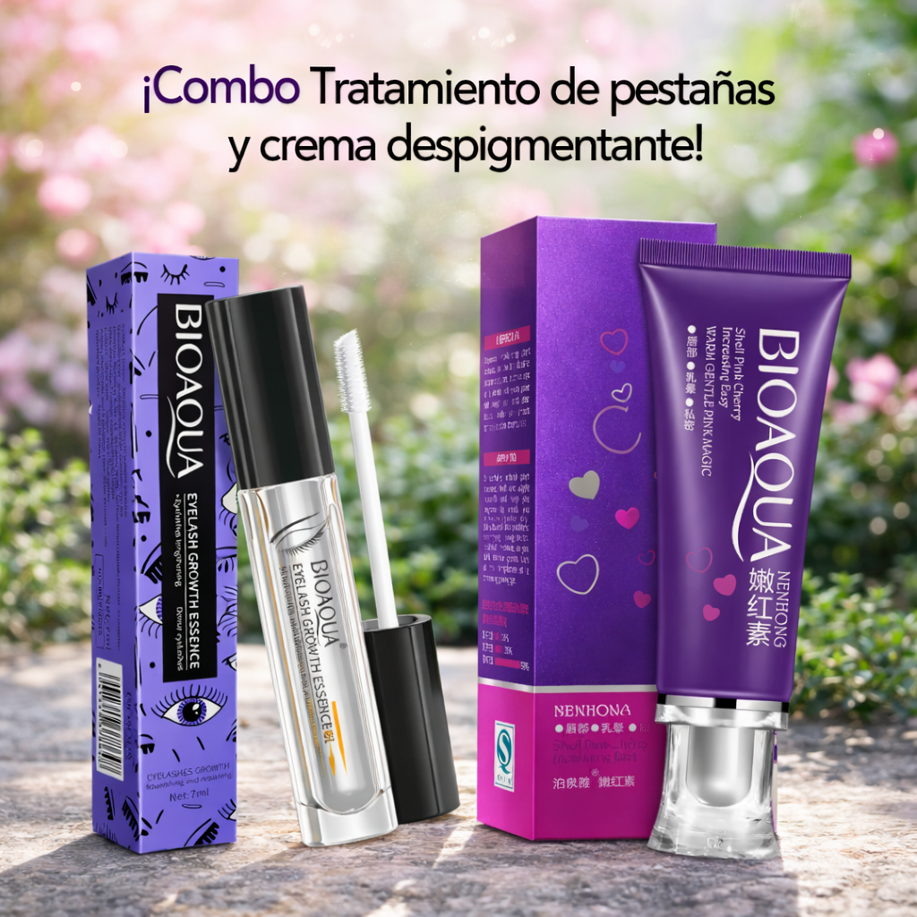 COMBO CREMA ACLARANTE Y DESPIGMENTANTE CON SERUM DE PESTAÑAS TRATAMIENTO DE PESTAÑAS Aplique 2 3 veces al día.Aplique el líquido a las raíces de las pestañas a lo largo de la línea de las pestañas, Aplicar el producto sobre las pestañas secas y limpiasLas personas que usan lentes de contacto deben quitárselos primero y esperar 15 minutos.Ayuda a mejorar la apariencia de las pestañas, cejas, barba y bigote. Crema Aclarante BioaquaContiene ingredientes naturales y ha sido especialmente formulada para ayudar a la decoloración de la piel en zonas intimidas, sensibles, y en las áreas más privadas, como las axilas, los labios, zona perianal, bikini y areolas mamarias